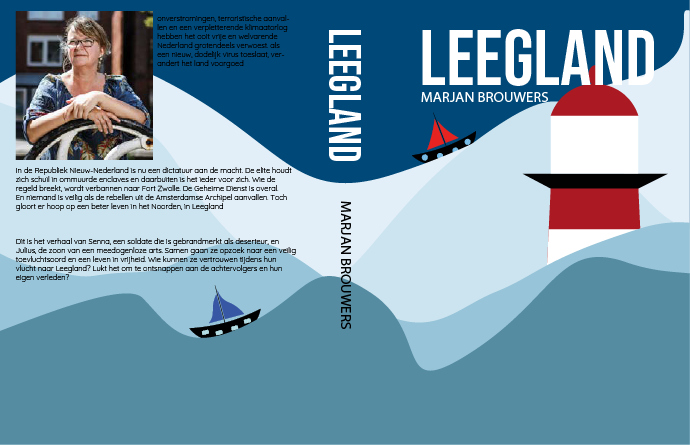 kaft + kaft mockup: Het idee van de kaft komt van dat het overstroomd is. Een deel van het verhaal speelt zich af op boten, daarom heb ik gekozen voor boten op de kaft. De vuurtoren komt van dat er vaak een vuurtoren word genoemd en het is belangrijk dat de zee goed verlicht wordt in de avond en op donkere dagen.