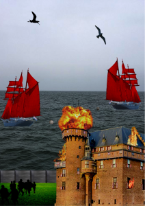Photoshop collage: Hiervoor heb ik een moment uit het boek gepakt en gemaakt hoe ik denk dat het er uit zou hebben gezien. Het gaat over het moment dat 1 van de hoofdpersonages uit een plek genaamd fort Zwolle ontsnapt terwijl die word aangevallen door de vijand. In het verhaal hebben de vijand rode zijlen op hun boten. Dus vandaar de rode zijlen op de boten.