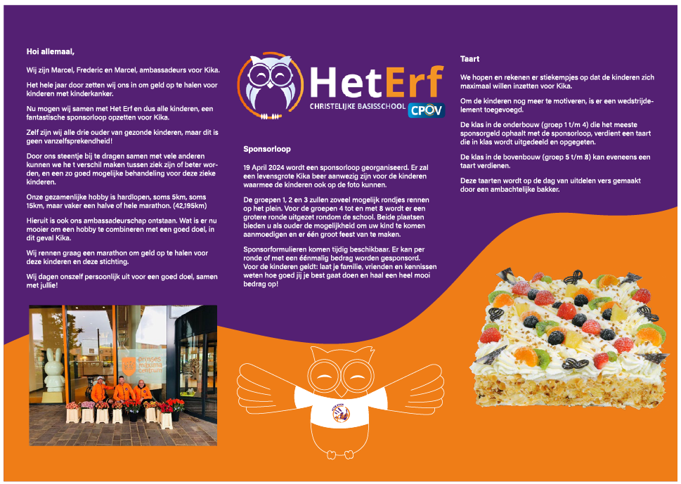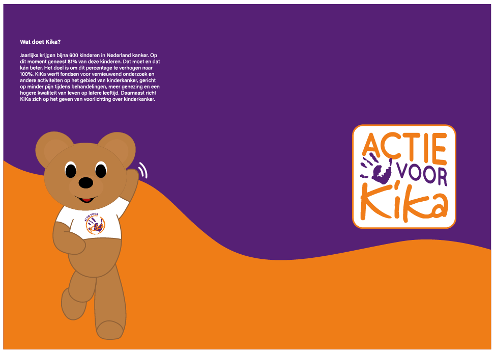 Voor deze opdracht werden we gevraagd om een drieluik flyer te maken voor een sponsorloop om geld op te halen voor kika. Voor het design heb ik de kleuren van kika gebruikt. Zelf heb ik nog een illustratie gemaakt van de beer van kika die aan het rennen is voor de sponsorloop. Ook heb ik de mascotte van de school gemaakt voor op de flyer.